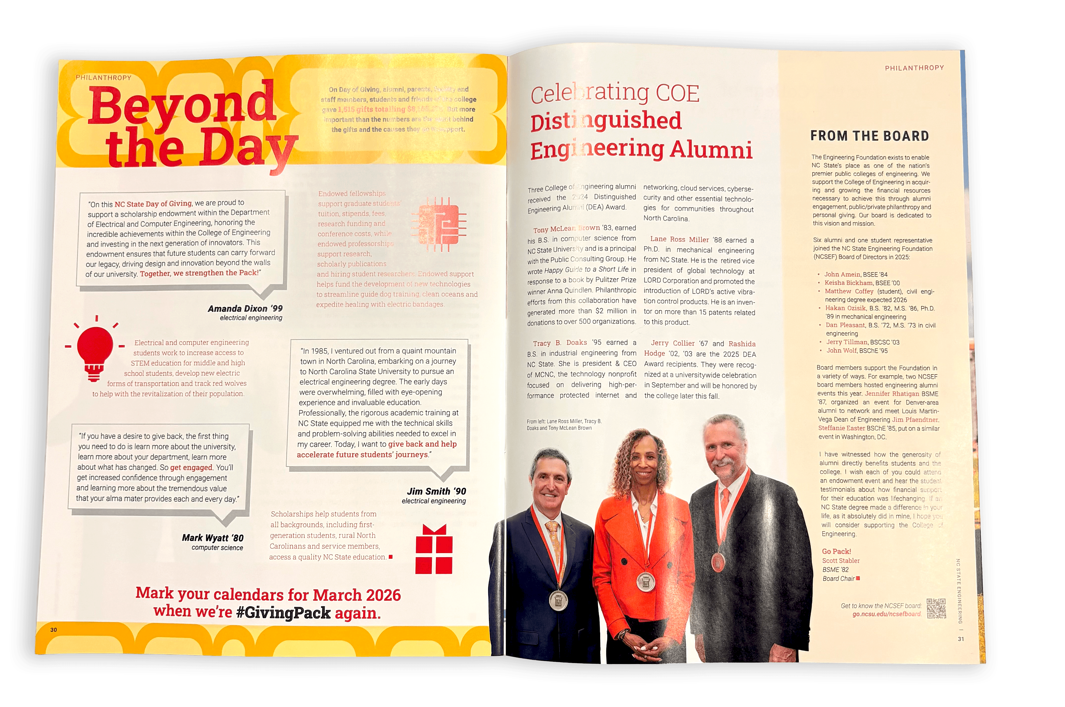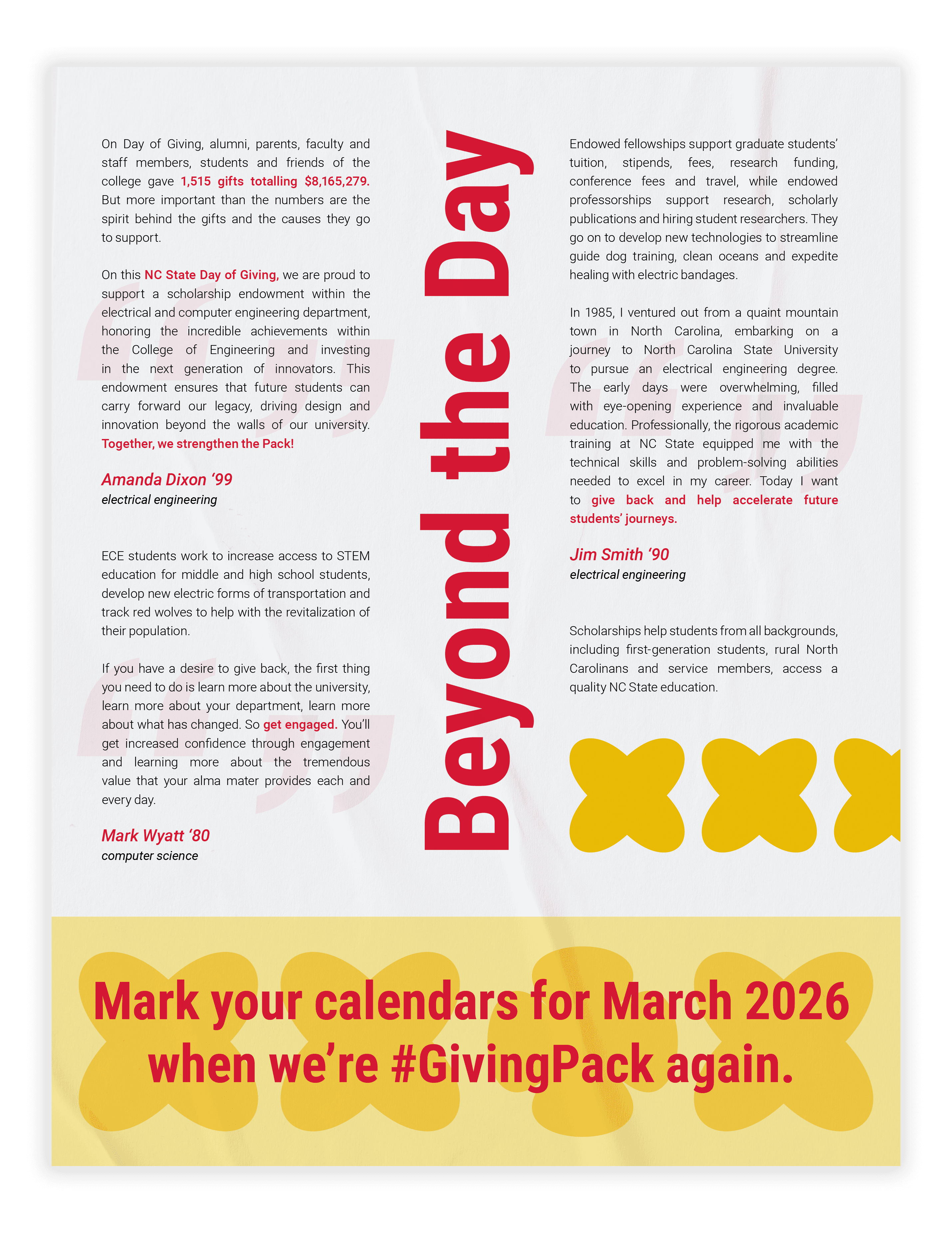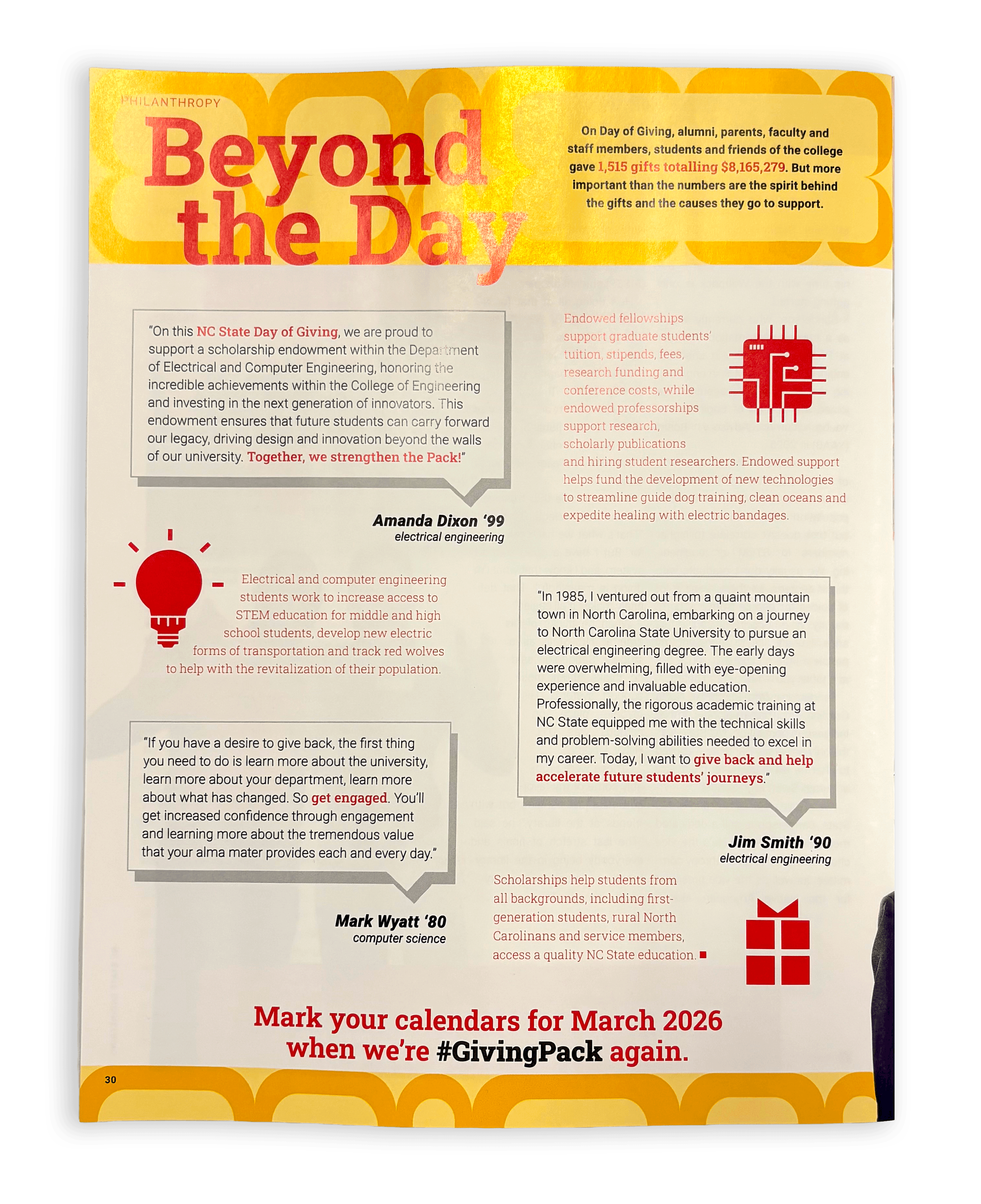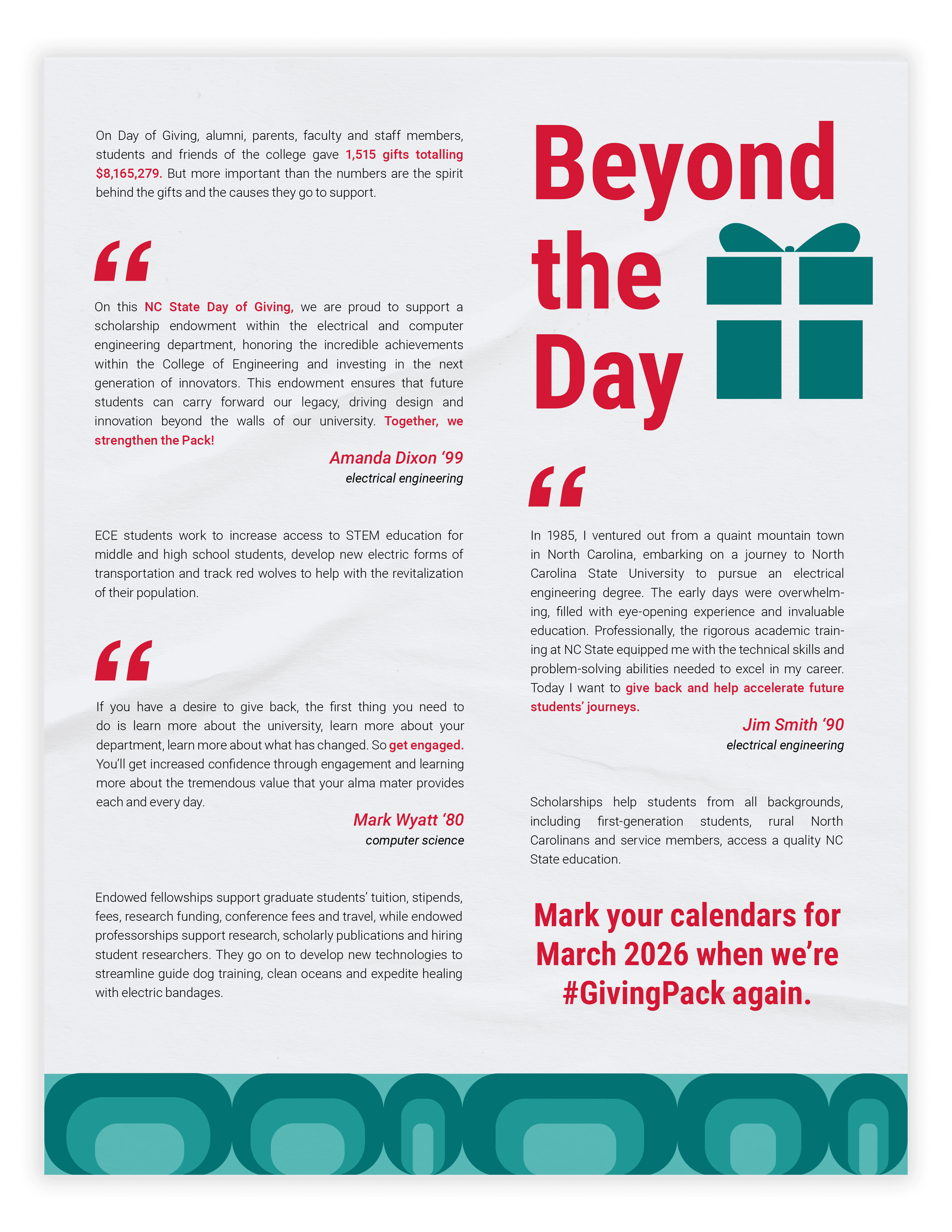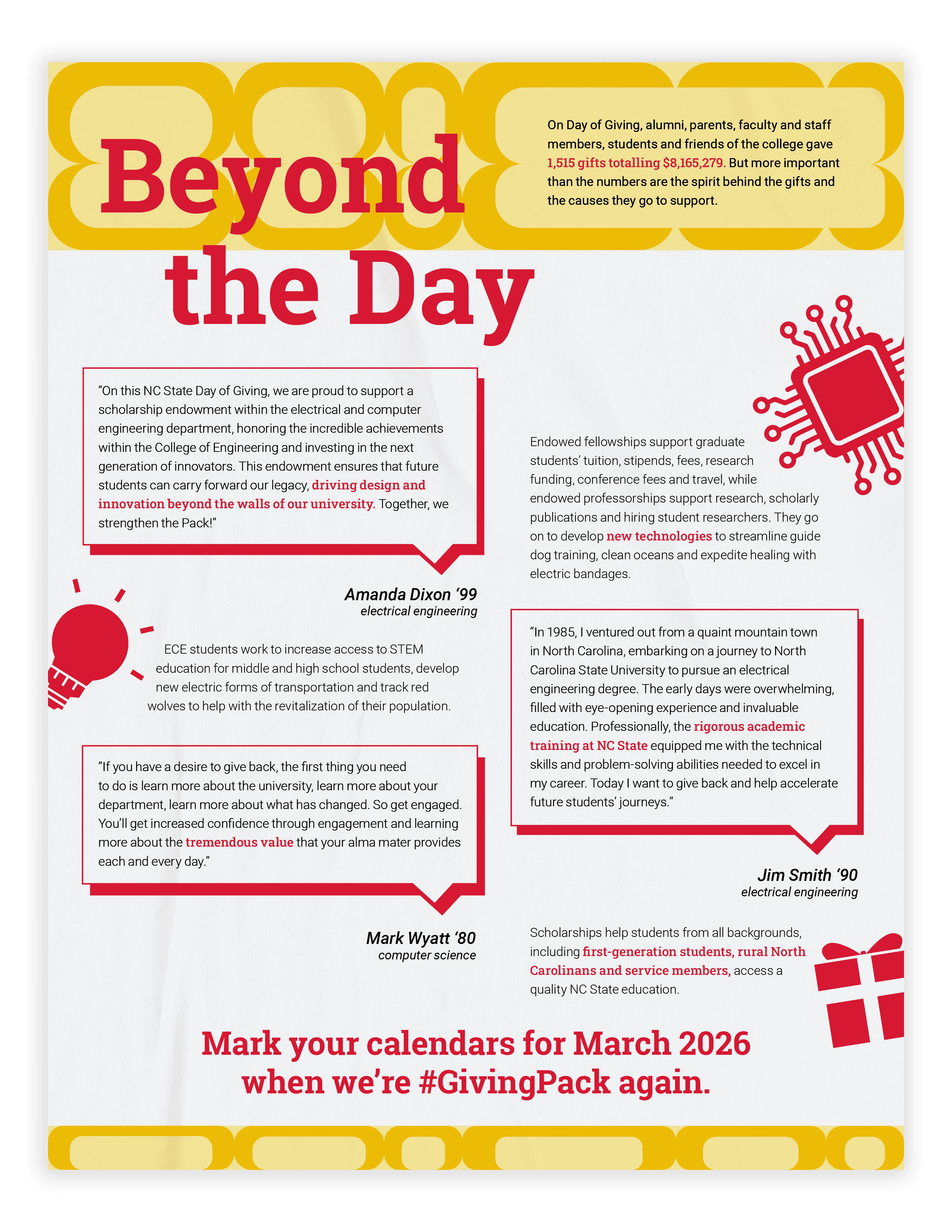 I designed a one page layout for the Engineering magazine's Fall 2025 issue to promote NC State's Day of Giving for the College of Engineering. I was given the body text that included quotes from alumni to include in the layout, as well as the requirement to include some sort of icon. Since this page was highlighting the impact that donors have on research and student's success, I wanted to make the visuals were eye-catching and interesting to draw the reader in and spark interest in donating to the college. The layout I designed was paired with another article to create the full spread.