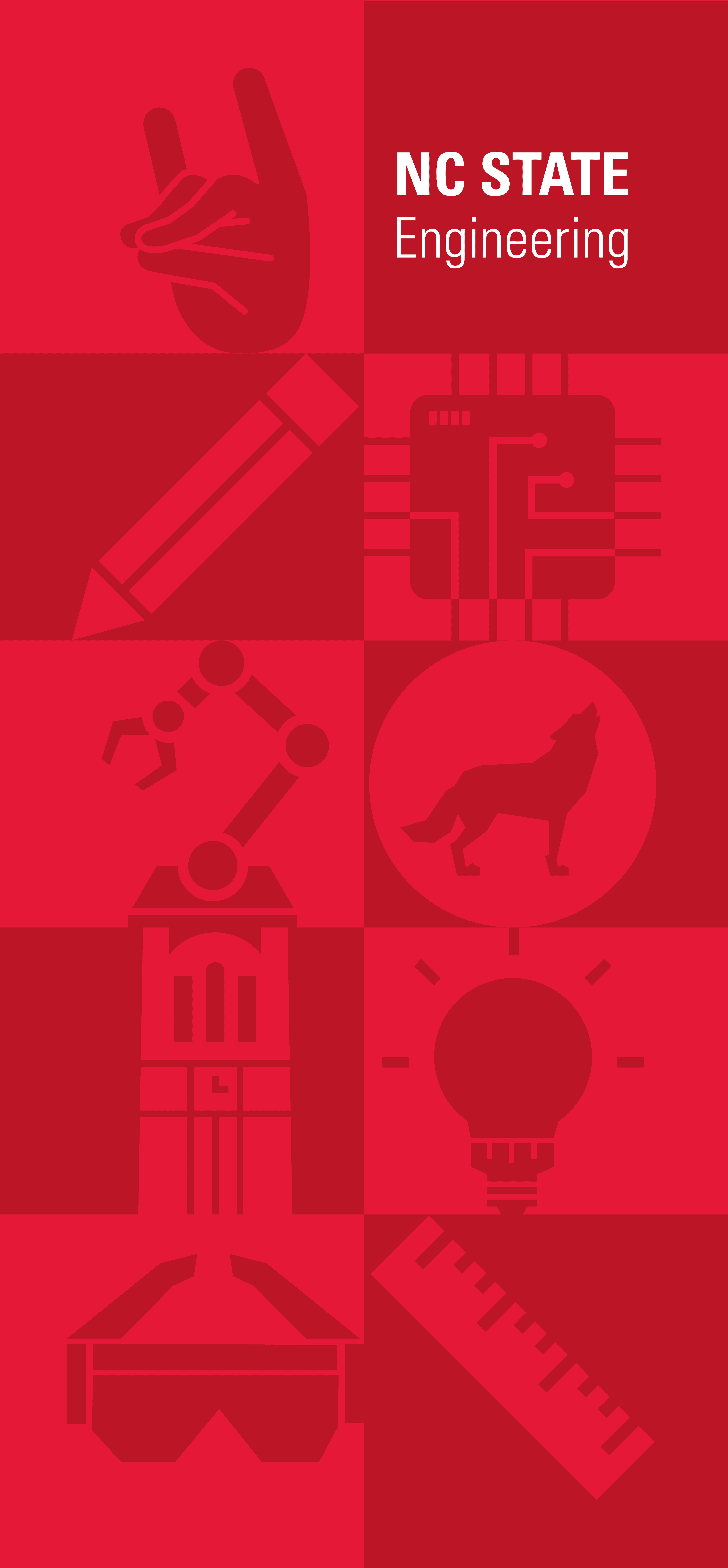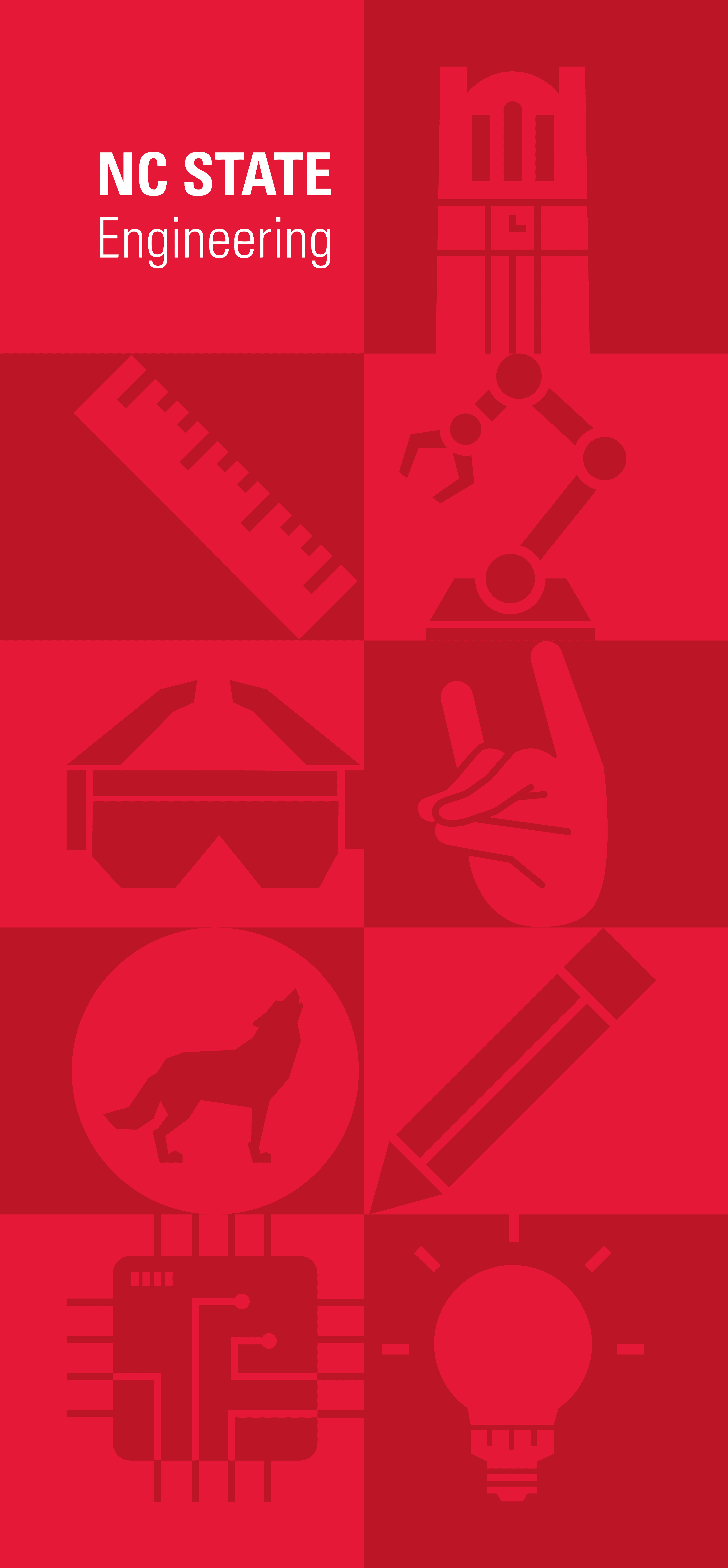 The outside panels include general NC State icons like the belltower, wolf circle, and wolf hand. The rest can be applied to engineering as things they use or make in their career. To add variety I alternated the icons for the right and left panels.