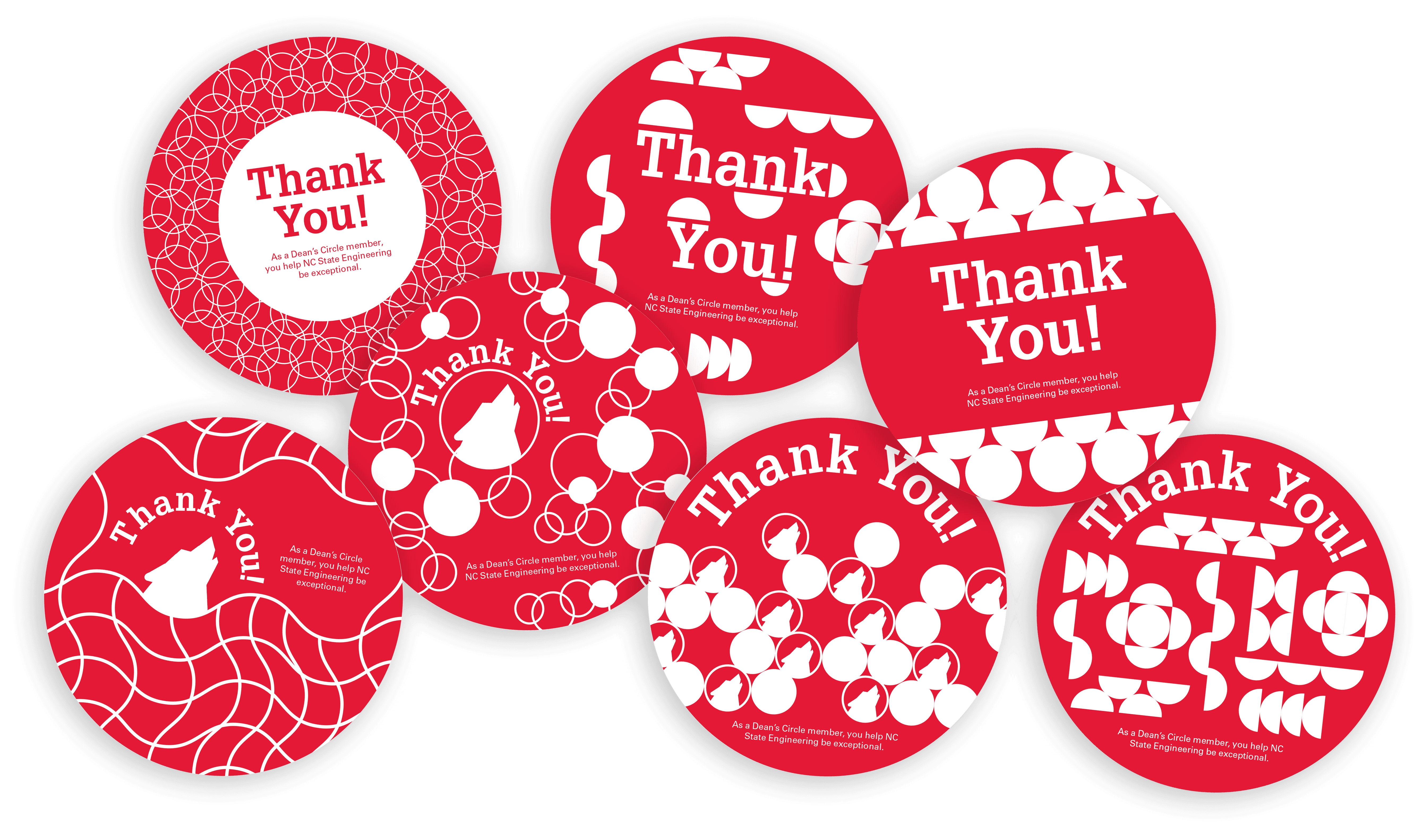 Given the name "Dean's Circle," I went with the most obvious choice of circles and half circles arrange in various ways. By just using a circle, it was a challenge to find different and fun ways to arrange them while also adhering to NC State's brand guidelines.